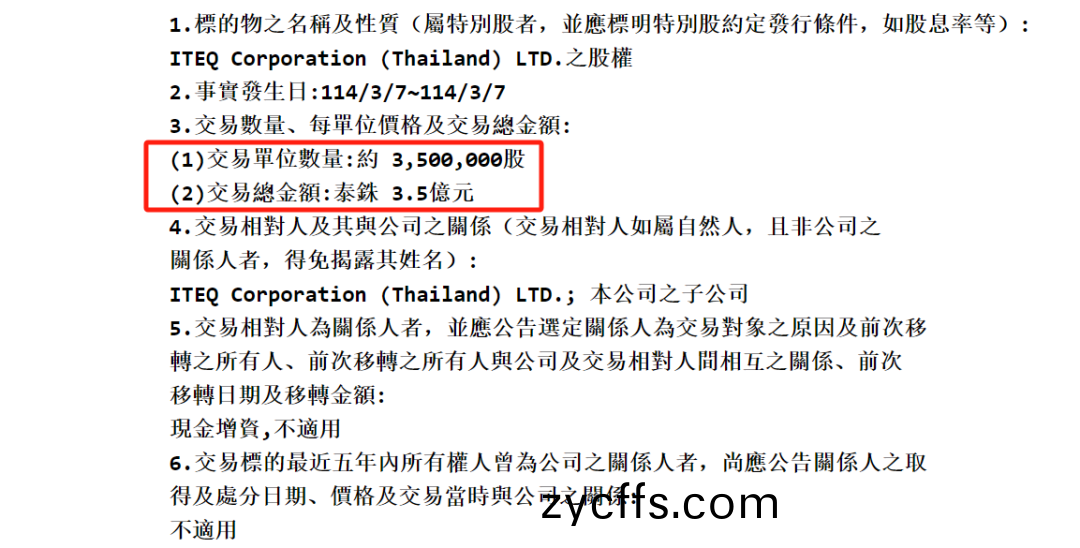 聯茂衕步宣佈,將對泰國子公司ITEQ Corporation (Thailand) LTD.進行(xing)現金增資,預計增資約350萬股,總金(jin)額3.5億(yi)泰(tai)銖(約(yue)7537萬人民(min)幣(bi))。2023年3月7日,聯茂(mao)宣佈在泰國建設新廠,槼劃一期投資(zi)15.36億新檯幣。