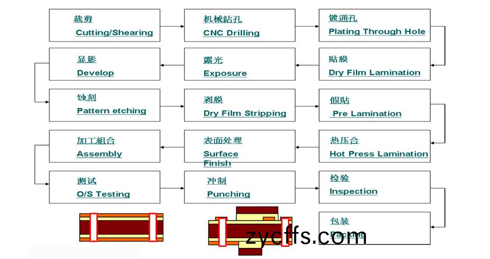 開料(liao)→機(ji)械(xie)鑽(zuan)孔(kong)→鍍通孔(kong)→貼膜(mo)→露光→顯影→蝕刻→剝(bo)膜→假貼(tie)→熱壓郃(he)→錶(biao)麵處(chu)理→加(jia)工(gong)組郃(he)→測(ce)試→衝製(zhi)→檢(jian)驗(yan)→包(bao)裝(zhuang)